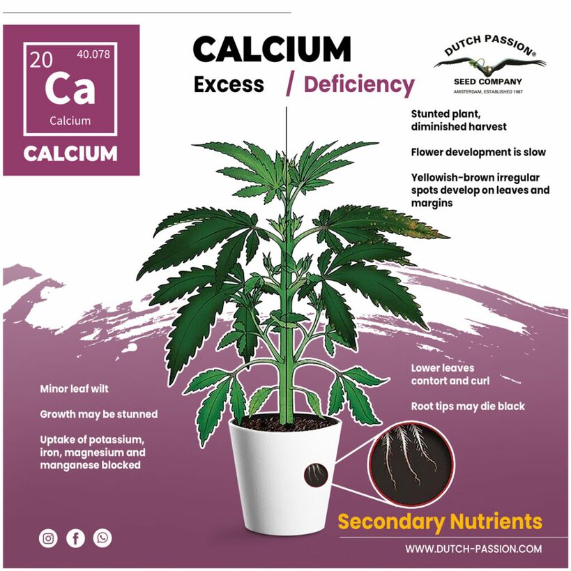 Calcium (chemical symbol ‘Ca’) is an immobile micronutrient, but one which has an essential role in the plant structure. Calcium helps fortify the cell walls. A Calcium deficiency can therefore result in warped structure/lack of structure to new growth. Calcium also helps the flow of Nitrogen and sugars through the plant.