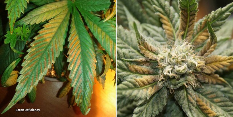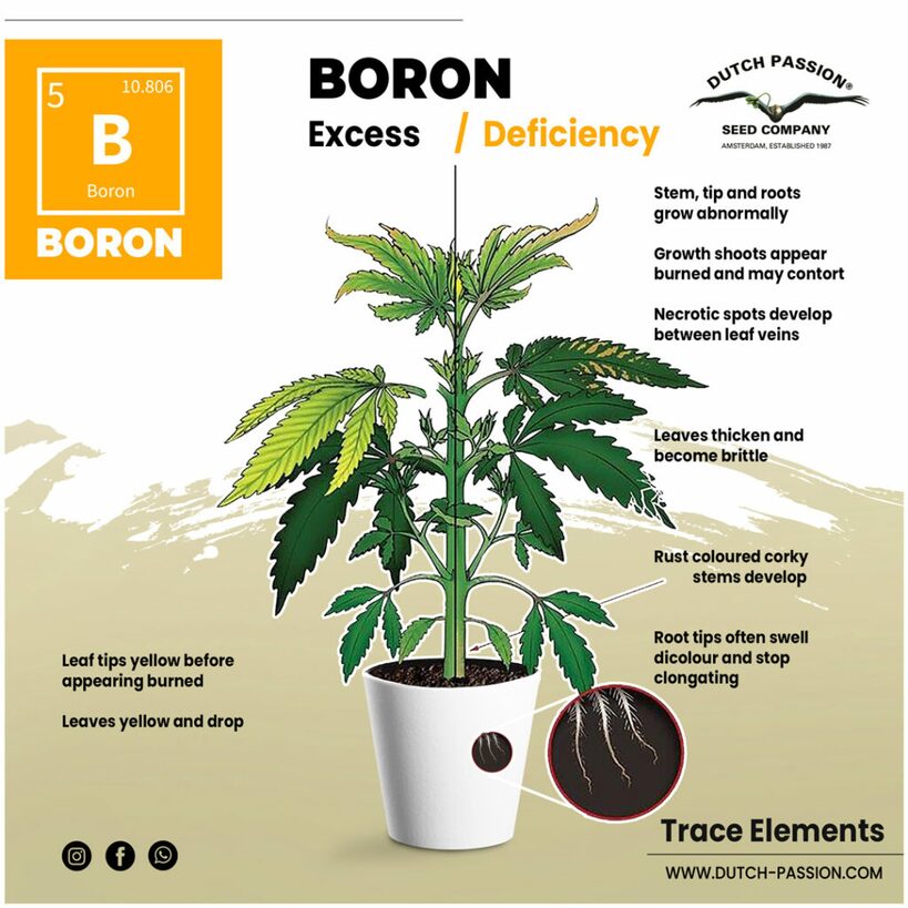 Boron (chemical symbol ‘B’) is used together with Calcium to ensure healthy cell walls and effective cell division. Boron is an immobile macronutrient. It is required in small amounts, so it is one of the less common cannabis nutrient deficiencies to see. Most good quality soils/compost contain sufficient Boron.