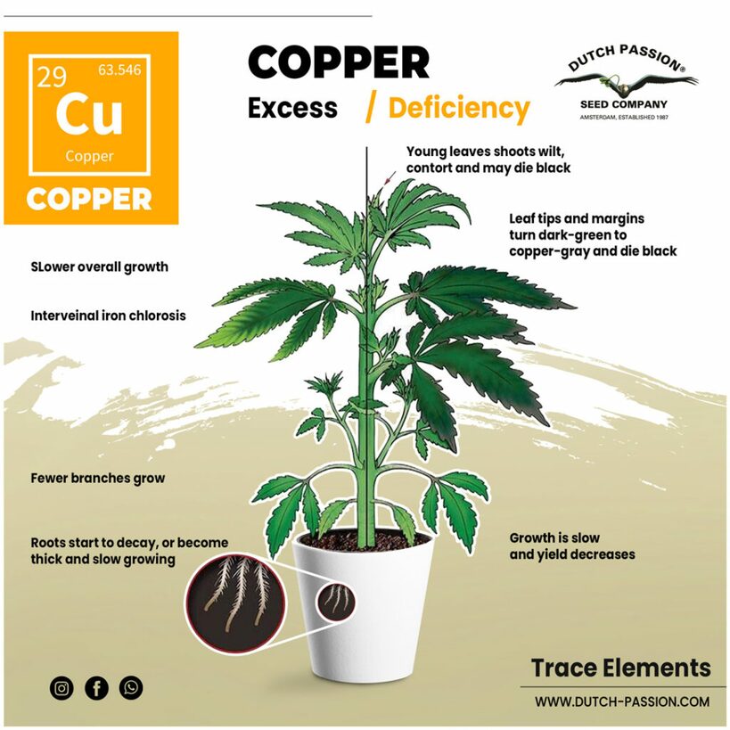 Copper (chemical symbols ‘Cu’) is a macro nutrient which is semi-mobile. It helps the plant utilise Nitrogen as well as assisting in the metabolism of carbohydrates. It’s unusual to see genuine cases of copper deficiency, most grow mediums and feeds have sufficient Copper for the plant requirements.