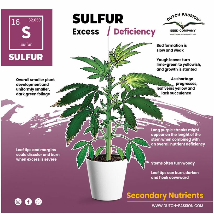 Sulphur (or Sulfur) is a critical immobile micronutrient. It’s used for vital enzymes and proteins. Sulphur is essential to plant respiration as well as for the synthesis and breakdown of fatty acids. It also plays an important role in the synthesis of oils and terpenes. Deficiencies of Sulphur may be caused by the loss of Phosphorous (due to a high pH level) in the root zone.