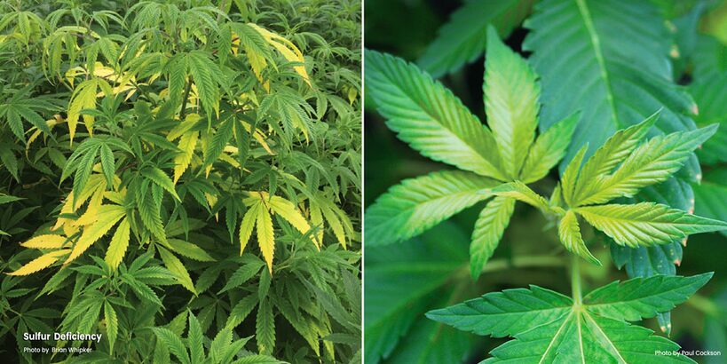 It’s uncommon to see Sulphur deficiency, but if you have it you may see young leaves turning lime green before turning yellow. You may observe stunted growth followed by the gradual yellowing of leaf veins. The leaves may also be dry and brittle. Continued deficiency results in lowered potency and inferior yields.