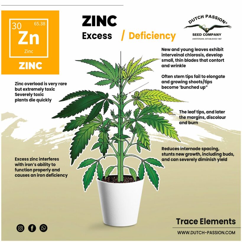 Zinc (chemical symbols Zn) is a metallic immobile micro nutrient. It’s important for the production of sugar and protein. Zinc is also used to make chlorophyll as well as for healthy stem growth. Deficiencies can be seen especially where alkaline soils and dry climates are present. It may also be the result of acidic pH levels. Zinc is only required in small quantities, but it is vital for the formation of cell membranes, proteins and plant growth hormones.