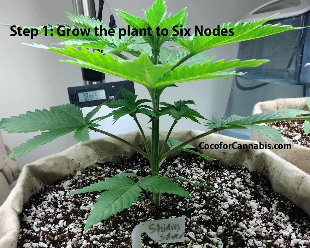 The first step in manifold training is to grow the plant out to six nodes. It is important to wait to allow the plant to develop six nodes before topping for the first time. As we explain in our article, “Topping Cannabis Plants: Why, When & How”, if you top earlier than this you risk stunting the plant. It often seems counterproductive to new growers to wait for growth and then cut it all off. However, the growth that is most important during this time is in the root system. Leaving the plant unmolested until it develops six nodes ensures that it has adequate time to develop a good root system. An established root system will prevent shock and help the plant to recover quicker from the topping.
