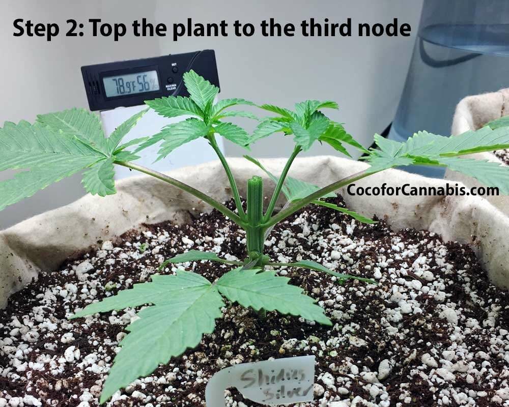 We top manifolds to the third node. This means that we remove the fourth node and everything above it. The branches growing from the third node become the two new “tops”. They are the main branches, and each will be topped again in time. The lower branches from the first and second node were removed during step one. Therefore, following this first topping there are exactly two branches on the plant.