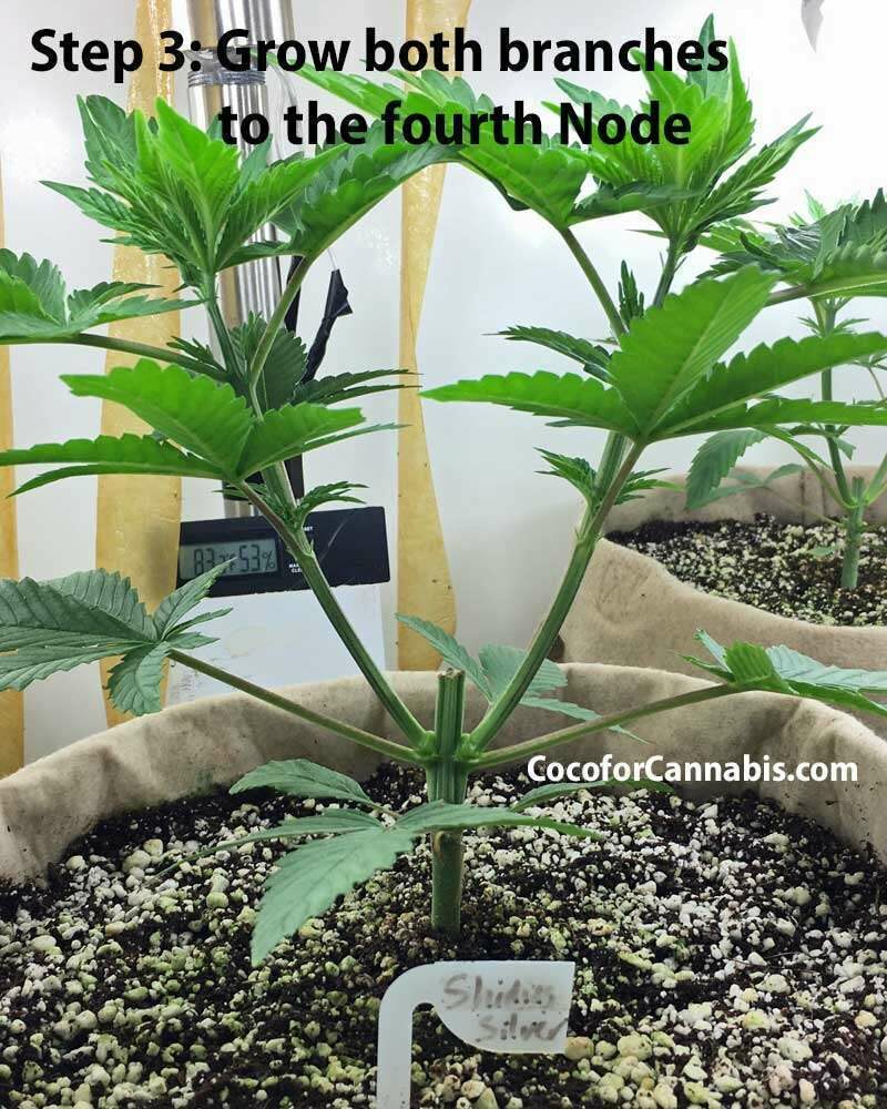 Following the first topping I allow my plants to grow unimpeded until each main branch is working on its fourth node. In coco, this usually takes 5-6 days. It will take somewhat longer in soil.